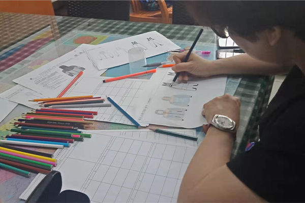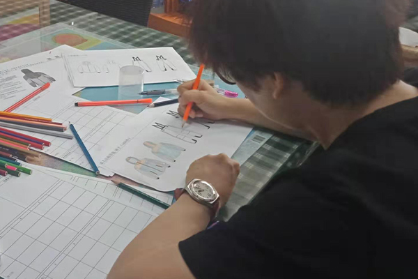 盡管困難重重,我們也要想進一切辦法做到,不僅要做好,而且要做到最好!我們的總經(jīng)理自己也搖身一變設計師——畫稿,可以看到以下的圖片,認真、負責的態(tài)度,用心的為客戶所思,一筆一筆的畫好,一點點的涂好顏色;還有一個紙樣哥哥也在幫忙畫,他們兩個人在一兩天的時間內(nèi)要畫好接近10個款衣服和褲子,雖然我們的時間不多,但是睿牛的小伙伴們也是很努力的去做,努力過就不曾后悔。