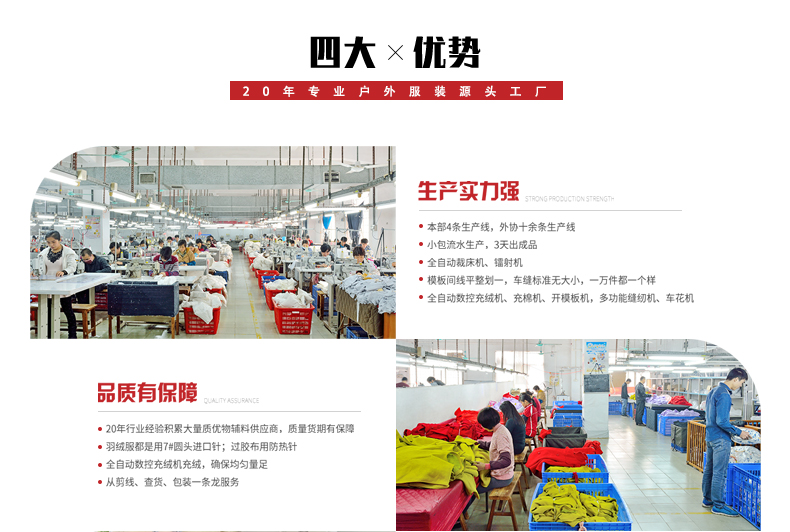 而佛山思諾華服飾公司(佛山睿牛制衣廠),很早就開始一站式中高端定制沖鋒衣代加工生產,擁有強大的精英設計、運營、促銷、銷售和生產團隊。在國內,20年來,思諾華服飾(佛山睿牛制衣廠)一直堅持穩固的原則,從始至終專注于定制行業,堅持創新,顛覆和重組,為社會、企事業單位提供準確、專業、方便、熱情的高端羽絨服、滑雪服、沖鋒衣定制等服裝生產加工服務。