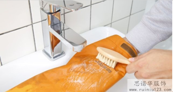 2、先用軟毛刷,在沖鋒衣弄的較臟的部位首先進行刷洗,一定注意不要太過于力過猛;