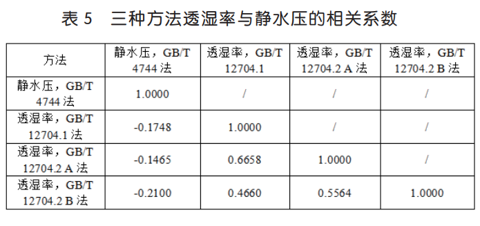 表 1 的測試數據,對三種透濕率測試指標和靜水壓指標進行相關系數分析,具體見表 5。