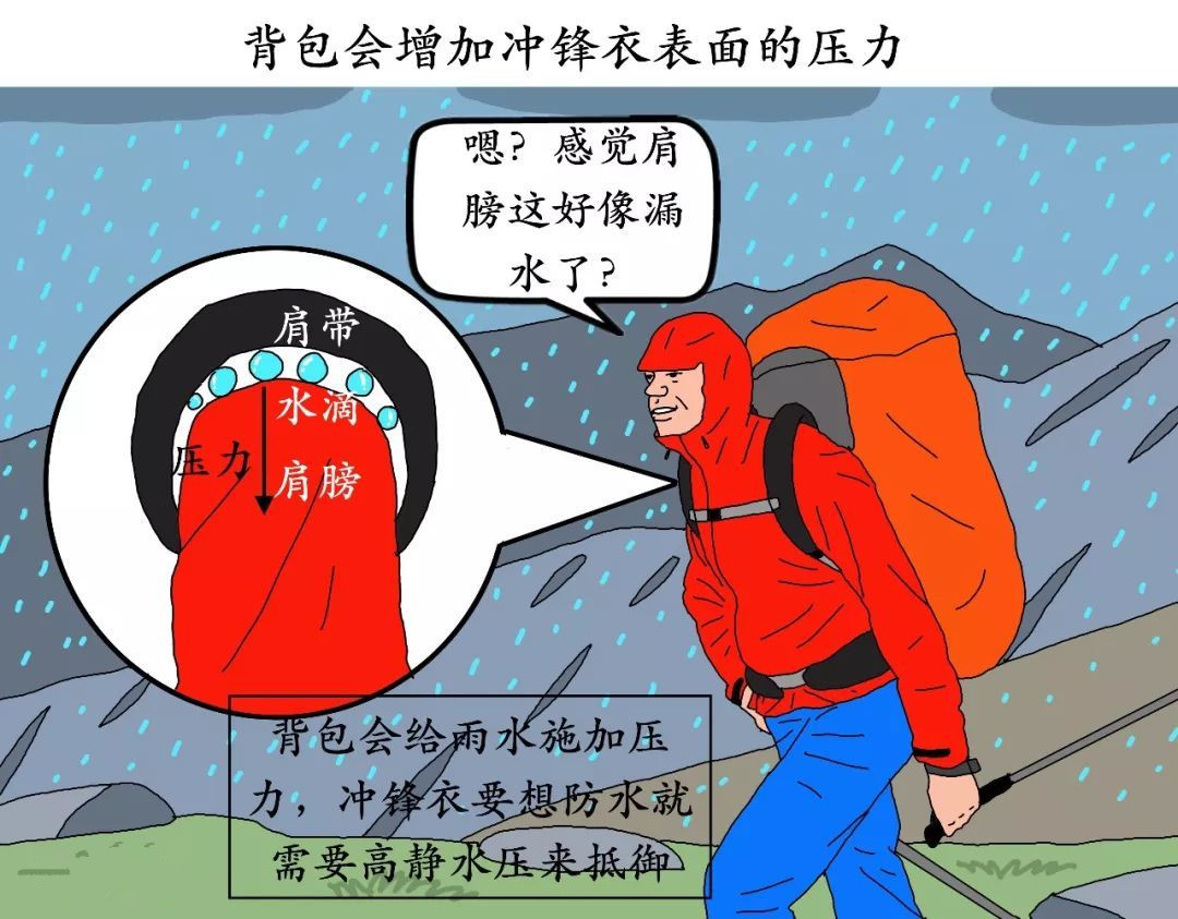 所以,雨越大,沖鋒衣需要的靜水壓越高。而來(lái)自背包、身體等壓力,會(huì)讓沖鋒衣的靜水壓需求更進(jìn)一步。