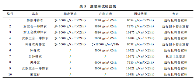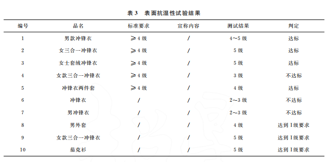 本文最終的判定是結(jié)合 GB/T32614—2016《戶外運(yùn)動(dòng)服裝 沖鋒衣》中面料功能性要求和產(chǎn)品銷售時(shí)的吊牌宣稱進(jìn)行。達(dá)標(biāo)是指符合沖鋒衣的合格品 標(biāo) 準(zhǔn) 要 求,反 之 則 不 符 合。10 件 樣 品中,只有5件達(dá)標(biāo),且只有3件是符合吊牌宣稱內(nèi)容。其中,標(biāo)示了 GB/T32614—2016的沖鋒衣,有3件達(dá)標(biāo),合格率為60%。近年來,監(jiān)管部門的抽查合格率一般在80%左右。這次比較試驗(yàn)合格率偏低的原因可能是樣品量較少,樣品的價(jià)格區(qū)間比較集中,且考核了接縫處的靜水壓。值得注意的是有2件沒有標(biāo)示 GB/T32614—2016的外套,其性能都符合標(biāo)準(zhǔn)要求。此外,銷售方對(duì)靜水壓的宣稱都偏高,有3件達(dá)標(biāo)了卻不符合自身的宣稱內(nèi)容。沖鋒衣 GB/T32614—2016標(biāo)準(zhǔn) 中 I級(jí) 對(duì) 靜 水 壓 的 要 求 也 只是:面料≥50kPa和面料接縫處≥50kPa,銷售 方卻往往宣稱100kPa,甚至達(dá)150kPa,而且也沒有充分考慮到面料接縫處靜水壓值會(huì)相對(duì)偏小的現(xiàn)實(shí)。需要警 醒 的 是,5 件 標(biāo) 示 了 GB/T32614—2016的沖鋒衣其綜合宣傳都不符合規(guī)定,存在執(zhí)行標(biāo)準(zhǔn)標(biāo)注正確卻夸大宣傳的嫌疑。