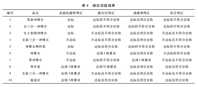 表面抗?jié)裥?、靜水壓和透濕率綜合統(tǒng)計(jì)的測試結(jié)果見表6。