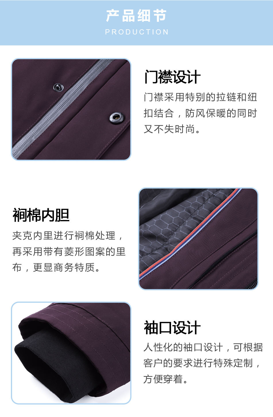 門襟設計:門襟采用特別的拉鏈和紐扣結合,防風保暖的同時又不失時尚。