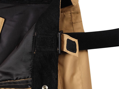 褲腰設計戶外滑雪褲加工的背帶與褲子鏈接處采用調節扣鏈接,帶子末端魔術貼加固,安全放心。