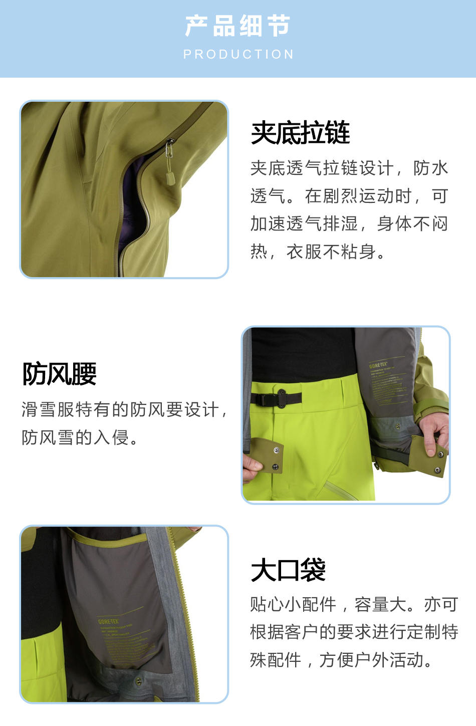 防風(fēng)腰:團(tuán)體滑雪服生產(chǎn)特有的防風(fēng)腰設(shè)計(jì),防風(fēng)雪的入侵。
